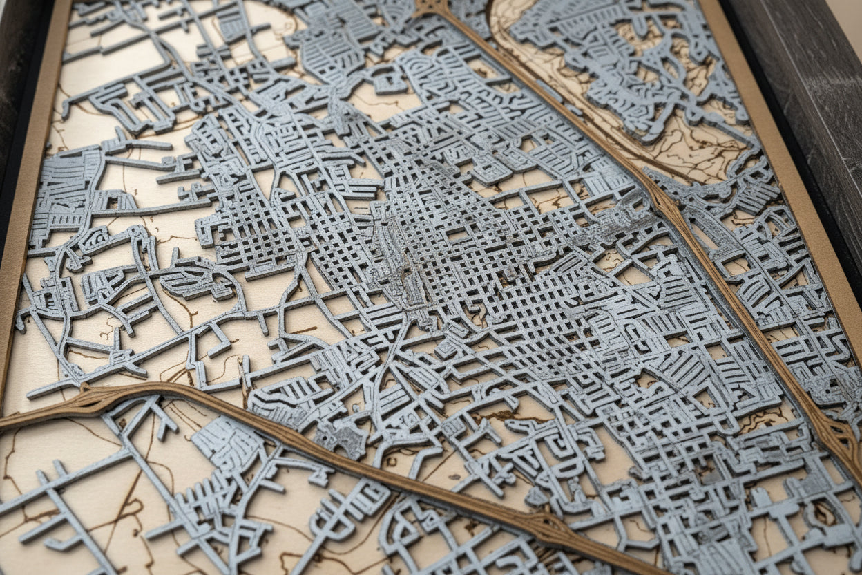 This laser-cut 3D city map offers a unique and accurate representation of its streets and landmarks. Perfect for displaying in your home or office, this map provides a detailed and stunning perspective an iconic city.