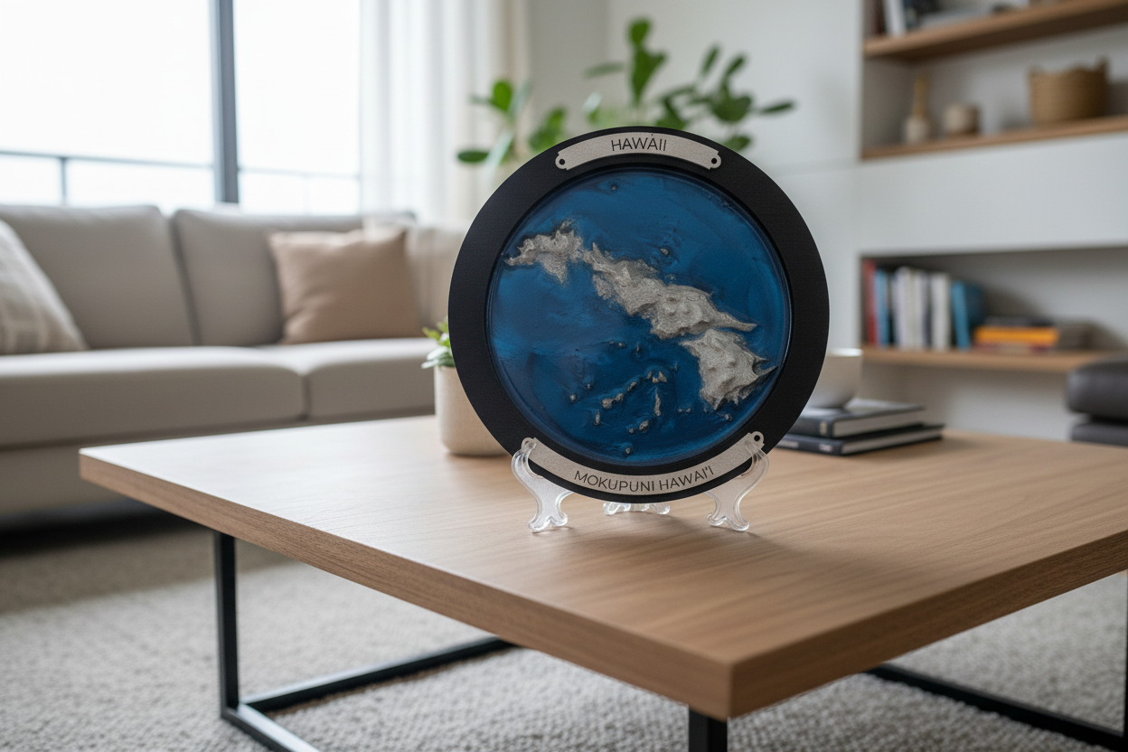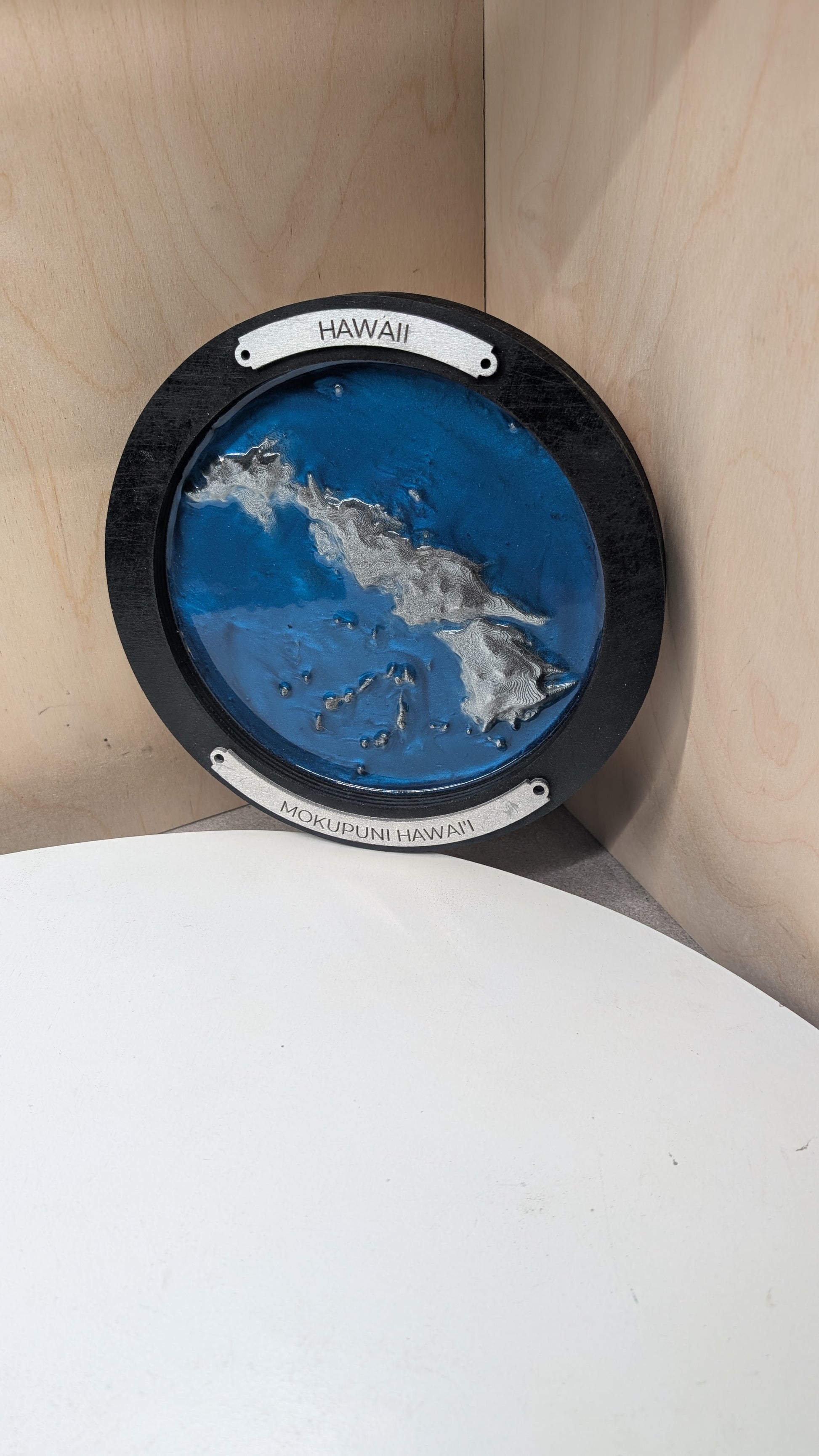 A topographical representation of Hawaii and the surrounding ocean floor (bathymetry). It is encased in a metallic blue epoxy.