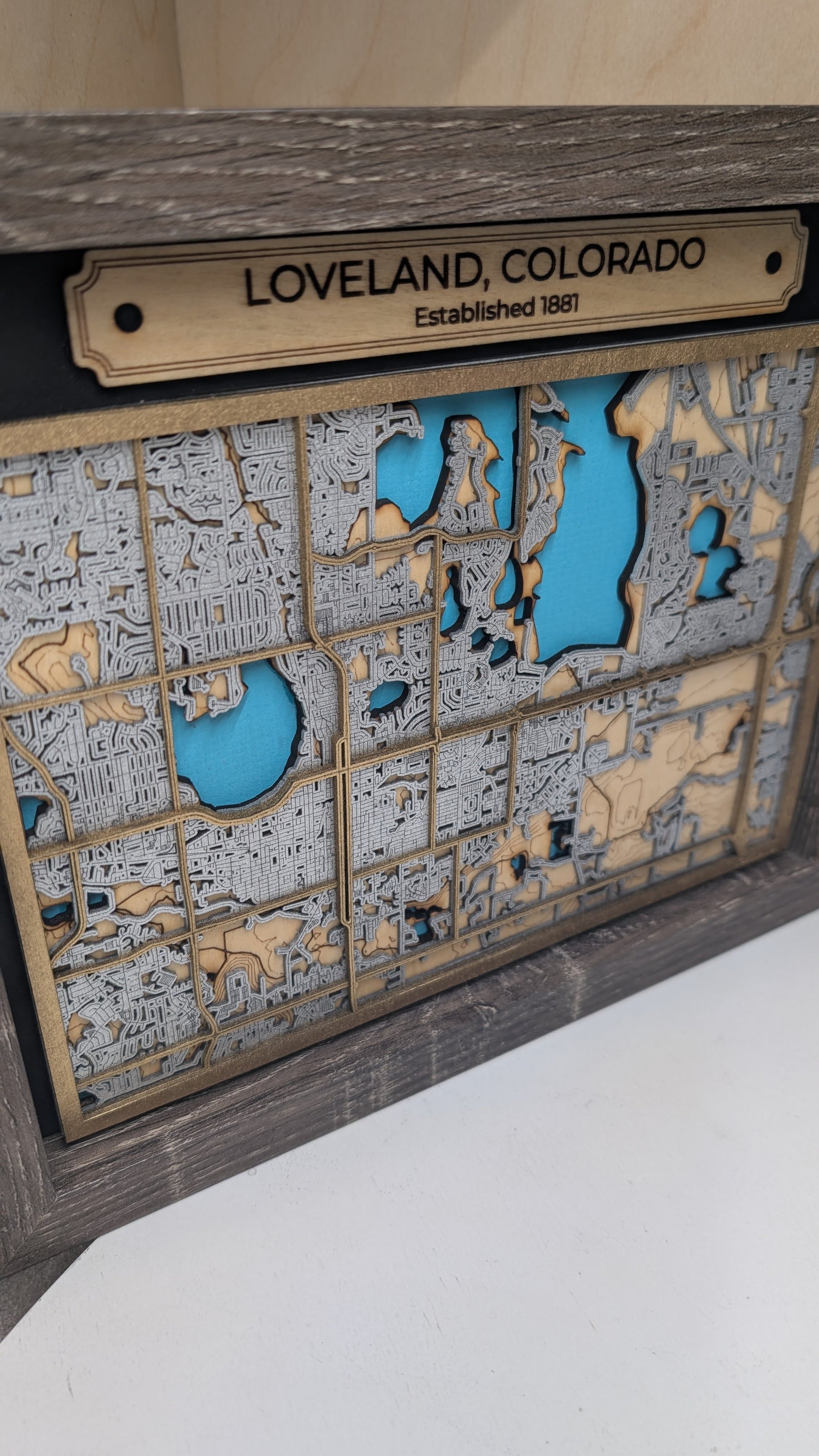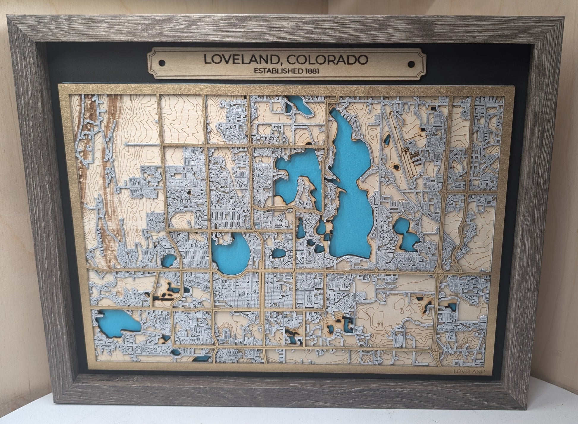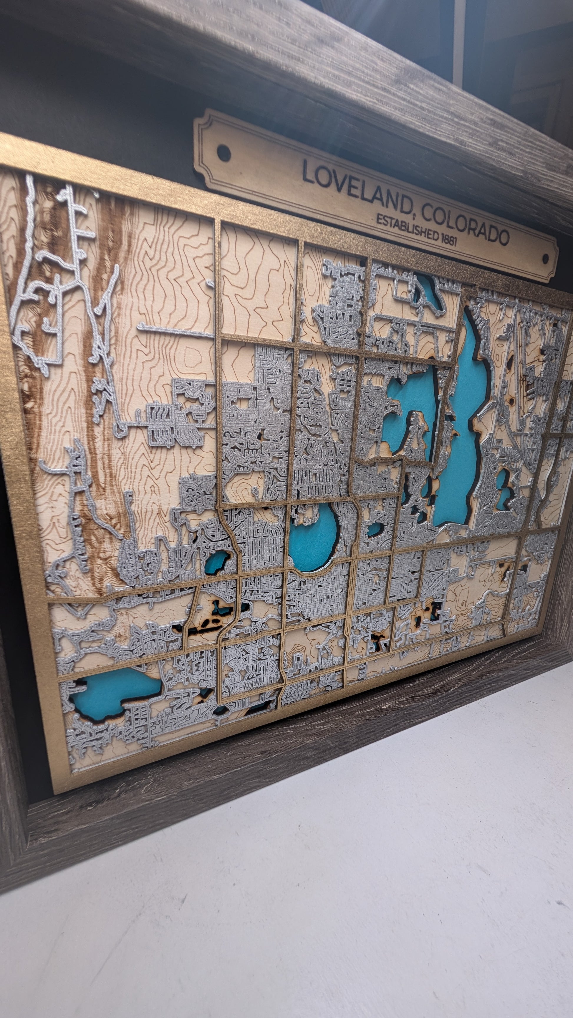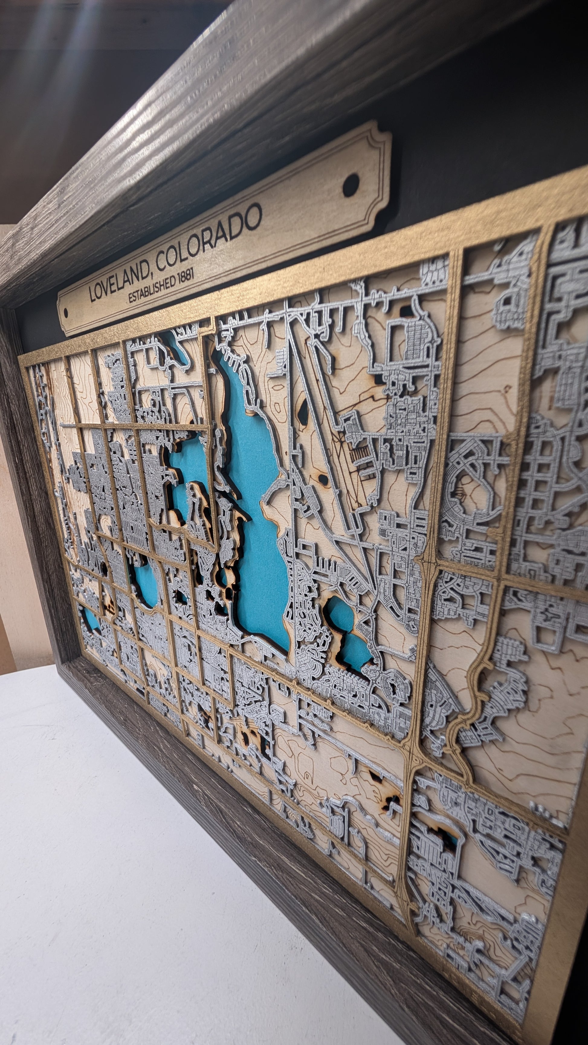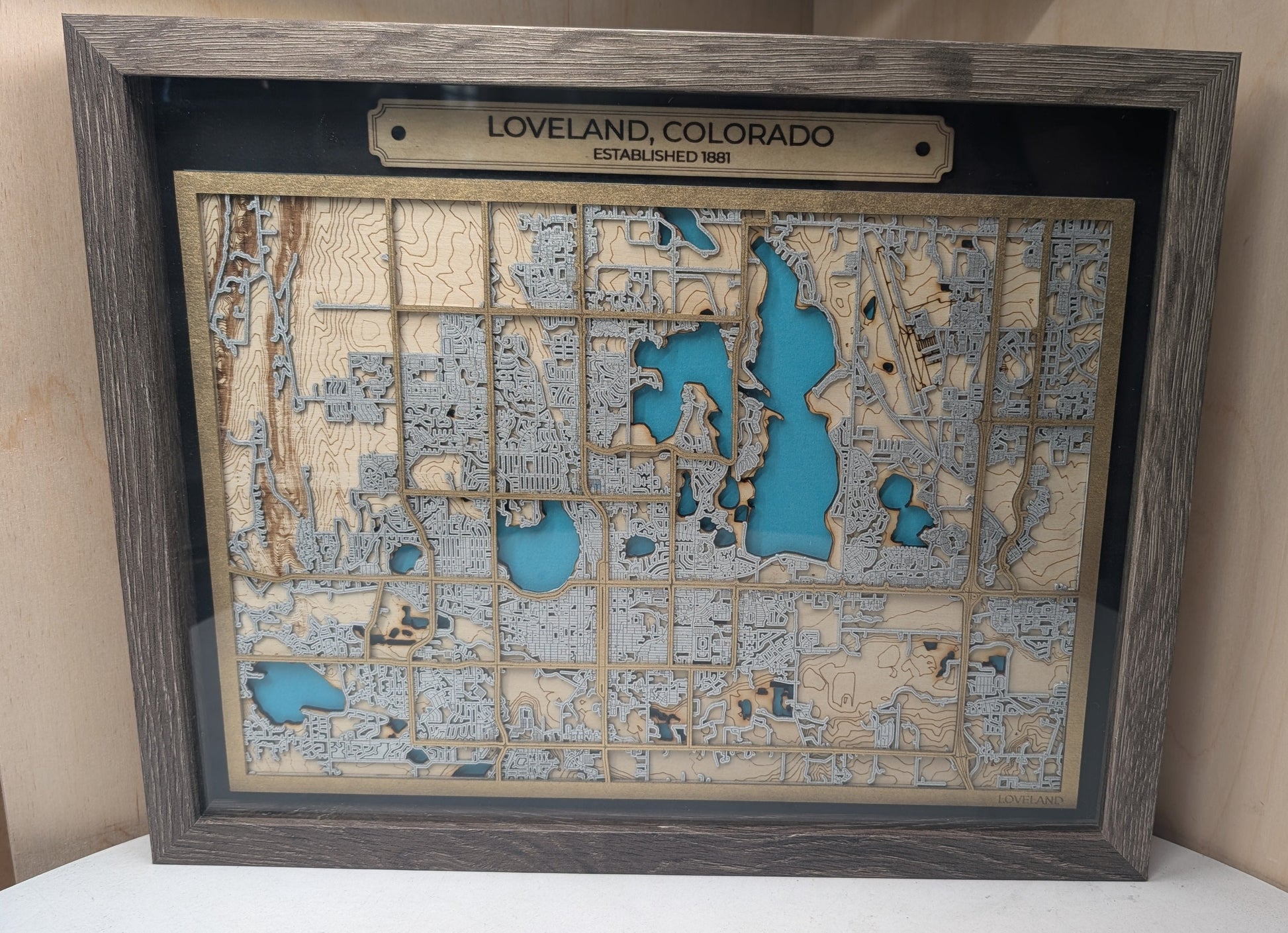 Discover the beauty of Loveland, Colorado with our laser cut map featuring intricate details of city streets, roads, and lakes. Perfect for home decor or as a unique gift. Experience the charm and history of this scenic city in a whole new way!