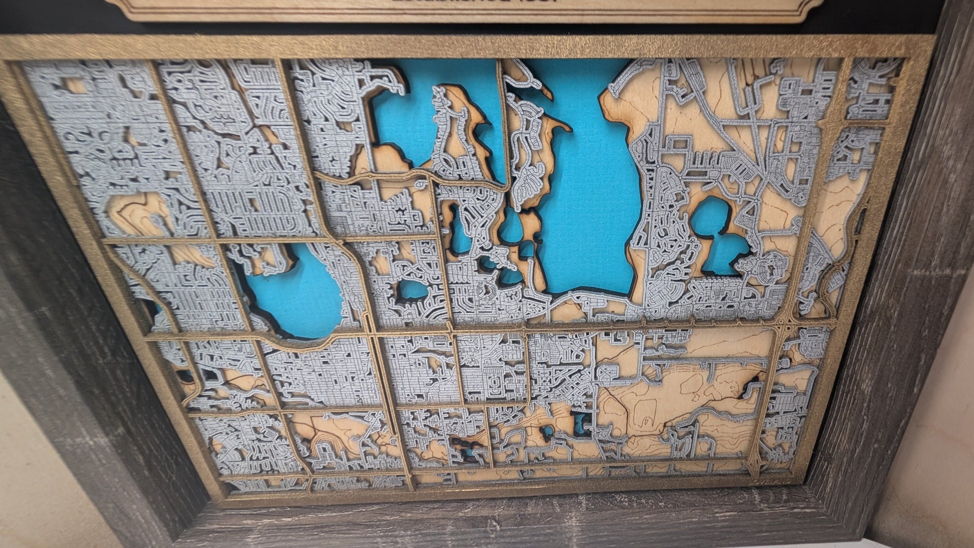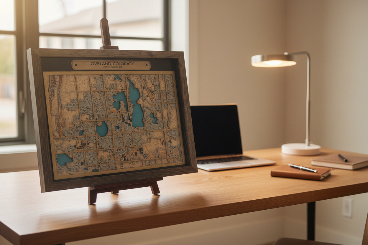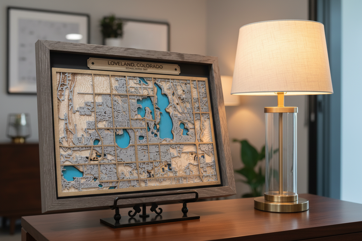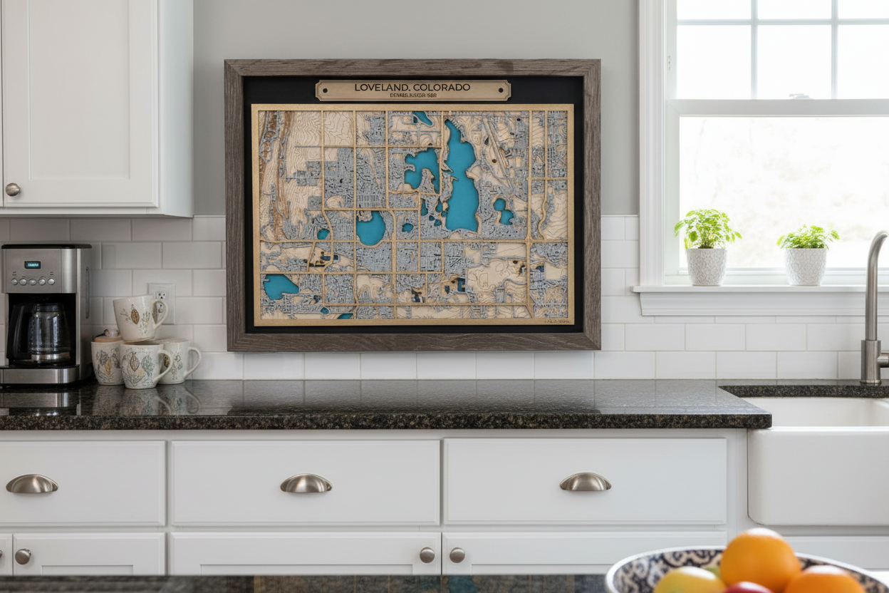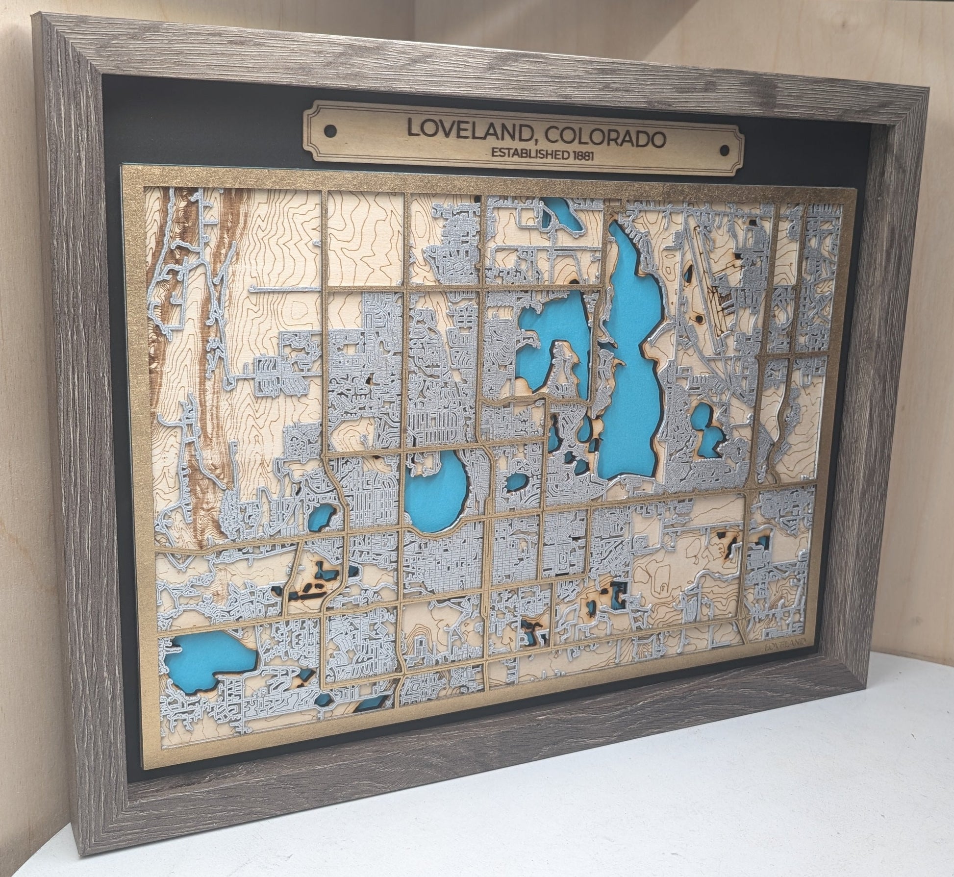 Discover the beauty of Loveland, Colorado with our laser cut map featuring intricate details of city streets, roads, and lakes. Perfect for home decor or as a unique gift. Experience the charm and history of this scenic city in a whole new way!