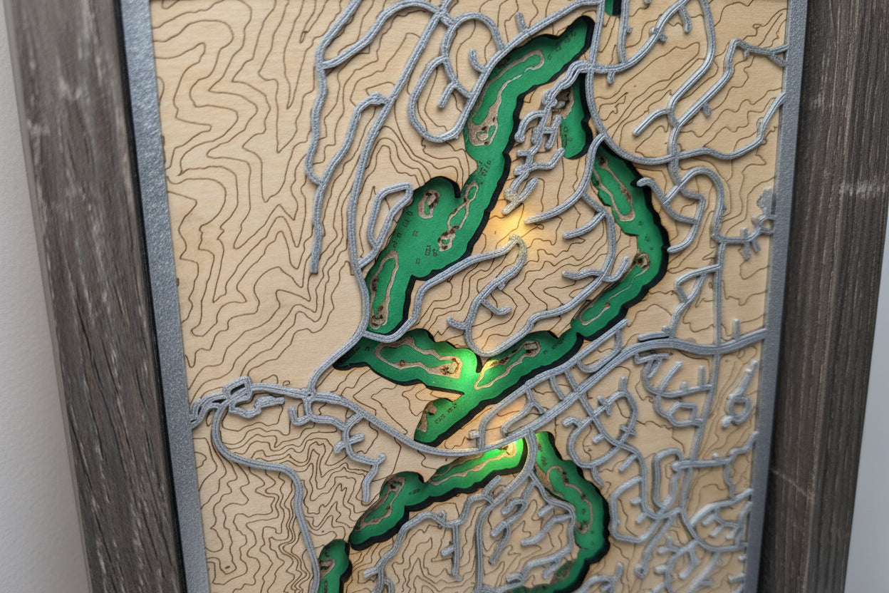Elevate your décor with an exquisite handcrafted 3D map of golf courses from all over the world. These artisanal pieces are precision laser-cut from select materials and include all greens, bunkers, fairways, and yes even water hazards!